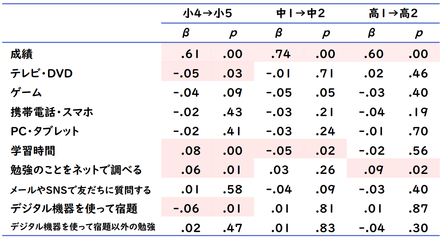注)ピンクの網かけ部は、統計的に有意だった箇所。
