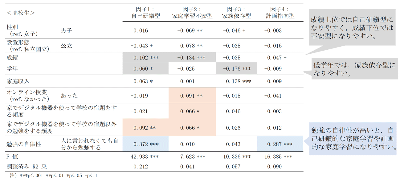 また、家庭学習の様子を、自己研鑽型、家庭学習不安型、家族依存型、計画指向型の4パターンに分類し(図10)、オンライン授業の有無や家庭でのデジタル機器を用いた学習の頻度がどう影響しているかを分析しました。その結果、中学生では、それらの影響がほとんど見られませんでしたが、高校生では、家でデジタル機器を学校の宿題以外の勉強で使う頻度が高いと自己研鑽型になりやすいことや、オンライン授業の実施とデジタル機器の利用が家庭学習の不安を高める一面があることがうかがえました(図11)。