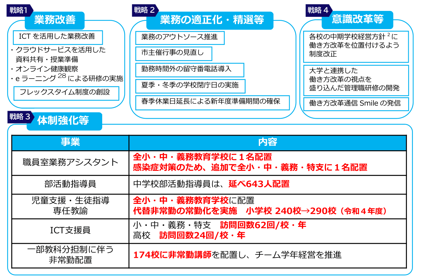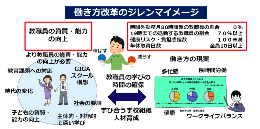 そして、教職員集団全体の持続可能性、教職員本人の中長期的な心身の健康、「教職」をより一層魅力的な職業とする観点から、