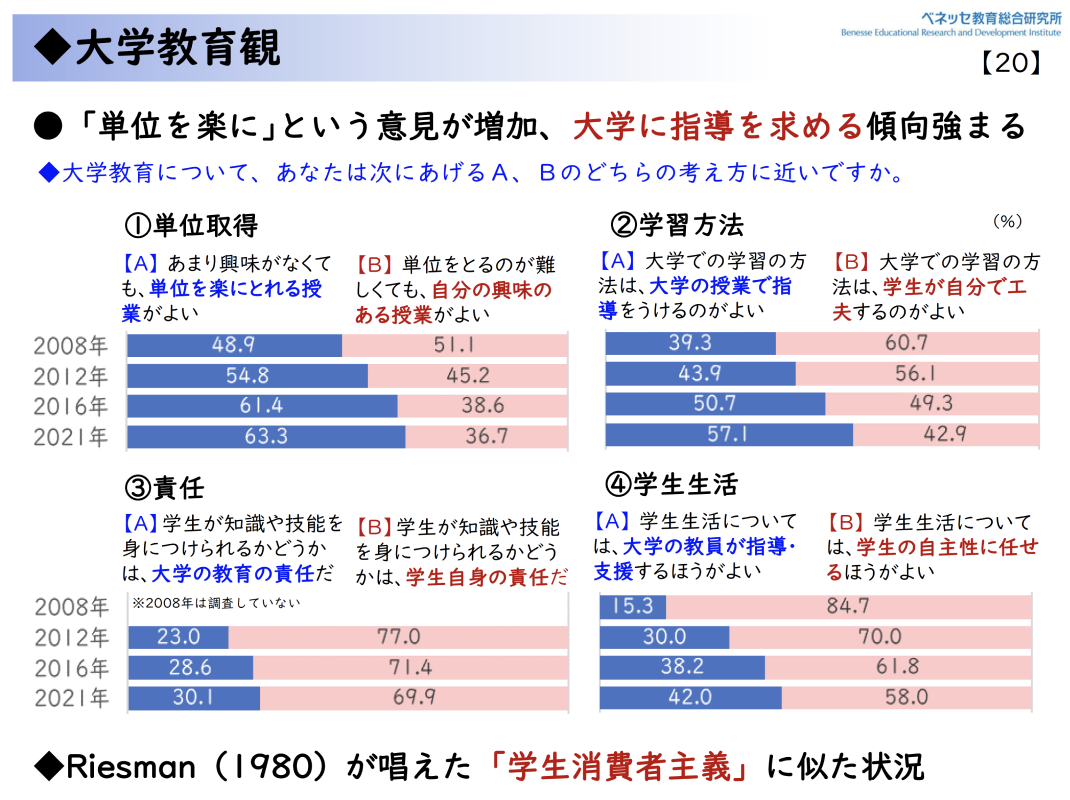 ベネッセ教育総合研究所の調査で、大学に依存する学生が増えているという分析結果(図2)がありましたが、それはコロナ禍の影響が大きいと思います。コロナ禍で友人をつくるのが難しく、頼れる友人が少ないため、必然的に大学に頼らざるを得ない現状もあるのかもしれません。大学には、学生が多くの人とつながる機会を設けていただければと思います。