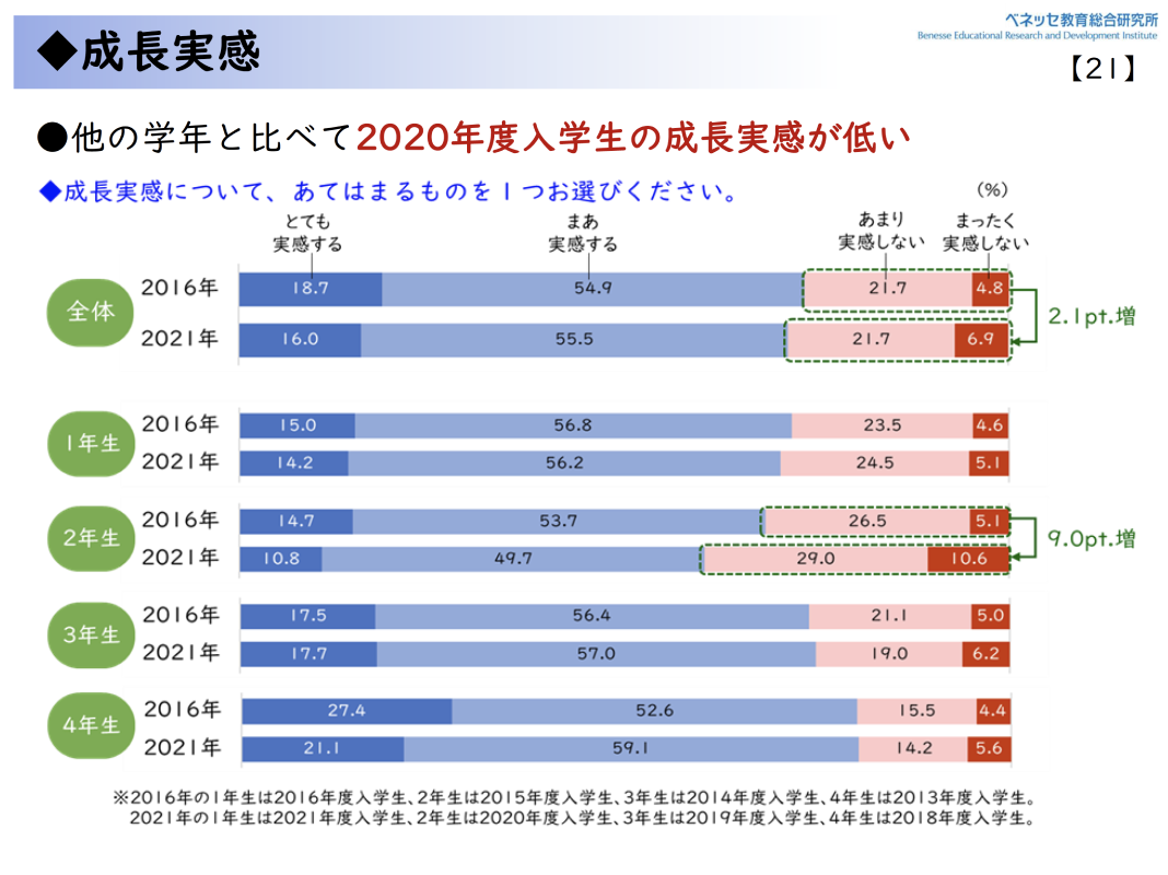 ベネッセ教育総合研究所の調査結果では、コロナ禍が大学生の成長実感に影響を与えている(図5)そうですが、高校時代に探究を経験した卒業生からは、オンラインが盛んになった結果、県外・海外の人たちと交流しやすくなったと、ポジティブな声が聞かれます。