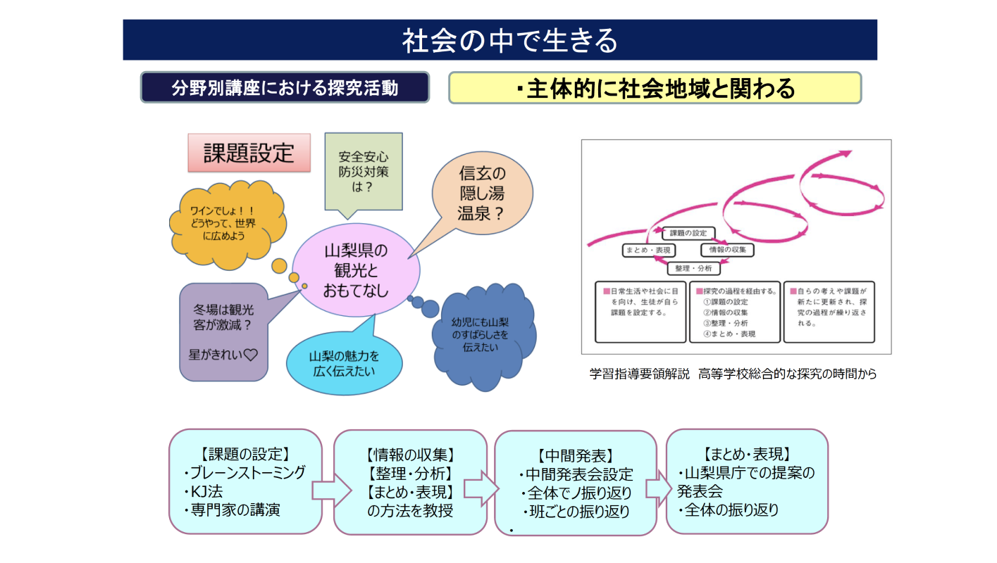 ある年は、「山梨の観光とおもてなし」をテーマに、県の観光振興課への提案をゴールとして活動しました(図4)。災害時の観光客の避難誘導について研究したグループは、武田信玄ゆかりの恵林寺にスポットをあて、避難所までの経路を検討し、景観に配慮した避難経路の看板を設置してもらいました。山梨とかかわりの深い『銀河鉄道の夜』に着目したグループは、星の観察を中心にしたツアーを企画し、観光振興課に採用されました。