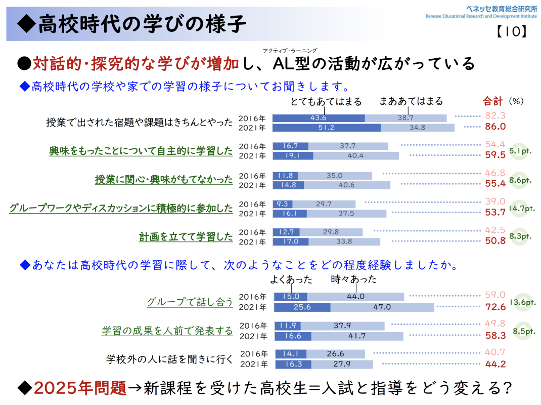今村 ベネッセ教育総合研究所の調査でも指摘されていた通り((図9))、高校で新学習指導要領が実施され、3年間、探究活動に取り組んだ高校生が大学に入学する2025年度は、ターニングポイントになると思います。