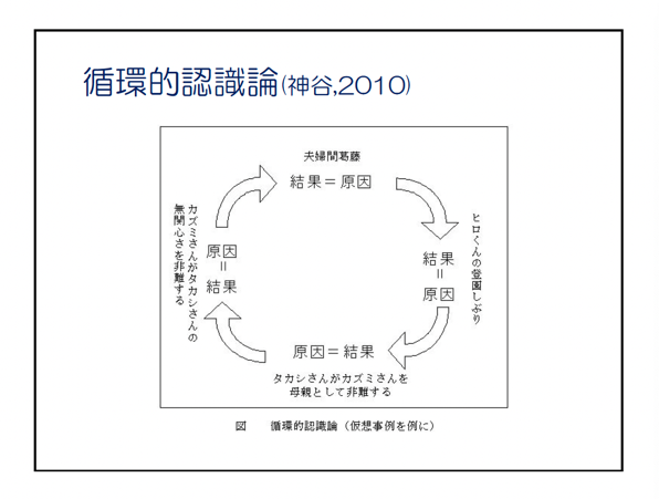 例えば、子どもが登校をしぶった際、父親が母親の育児を非難し、それを受けて母親が父親の無関心を非難すると、夫婦関係が悪化し、さらに子どもは登校しなくなることがあります。日常的な家族のコミュニケーションが、そのような原因と結果が連鎖する中で維持されているからです(図1)。