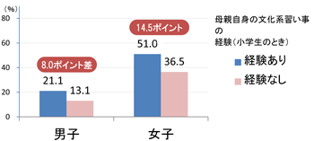 ②しかし、子どもの性別による影響のほうが大きく、女子に対しては母親自身に習い事の経験がなくても36.5%が活動させている。