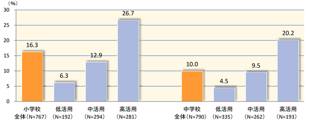少なくとも現段階では、授業にICTが普及しているとはいえない。そのための推進役・研究担当者が多くはない(注4)という事情とも重なってくる。図4は、ICT活用区分別に、回答者自身が「ICT活用の推進・研究を担当しているか」をたずねた結果である。そもそも、自分が担当者であるという回答は低い(小学校16.3%、中学校10.0%)。しかし、「高活用」では、自分が担当者であるという回答が多くなっている(小学校26.7%、中学校20.2%)。「高活用」の教員が、学校内でICT促進のために果たすべき役割は大きい。