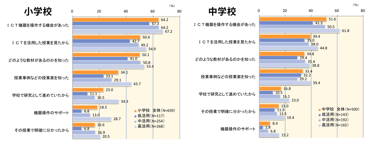 ICT利用者のみであるが、活用区分別にICTを授業に活用できた要因をみたものが、図5である(注5)。項目によっては違いもあるが、おおむね、「低活用」<「中活用」<「高活用」の順で回答割合が高くなっている。ICT活用促進のための機会を活用できたことが、「高活用」になっていると考えられる(注6)。