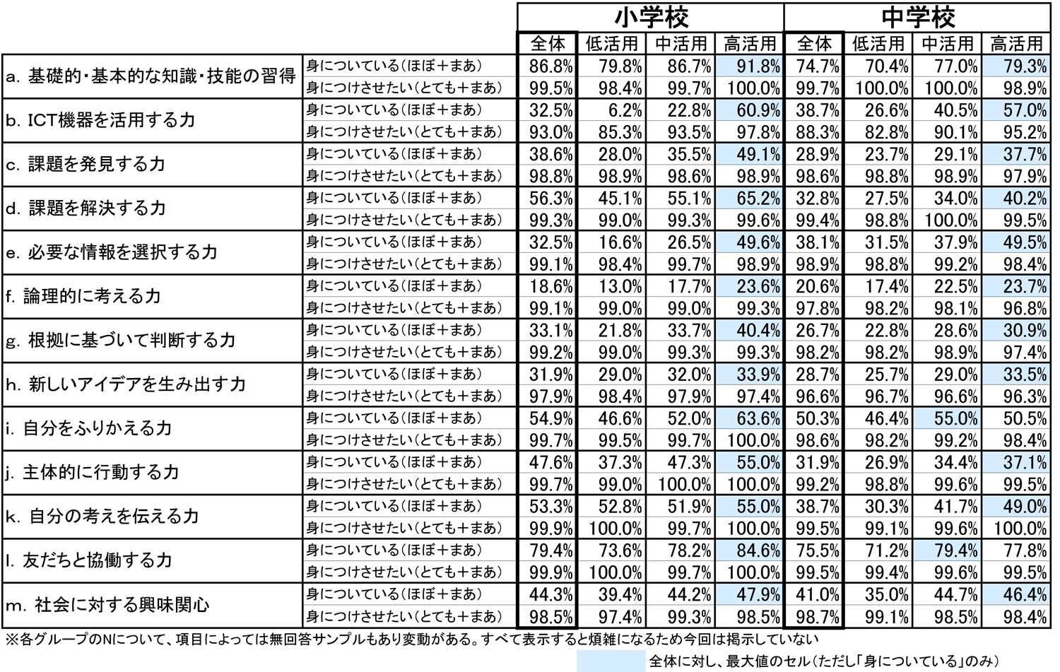 表1 小中学校別 活用区分別 子どもに身についている力・身につけさせたい力(一般校+実践校)