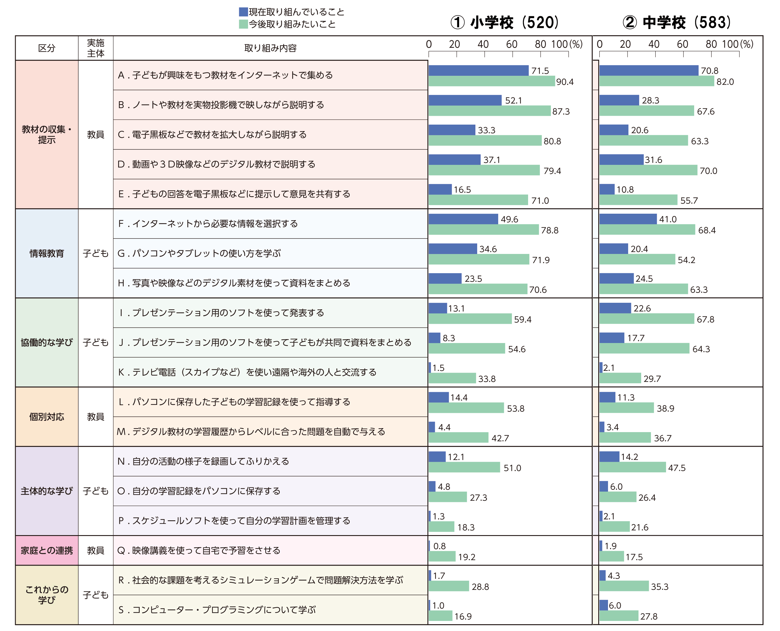 また、本稿では、主に基礎・基本習得の効率化・深化を図るためのICT活用について述べてきた。今後は、環境や研修についても、協働的な学びや主体的な学び、個に応じた学びをめざすICTの活用へとつなげていくことが求められるであろう。[END]