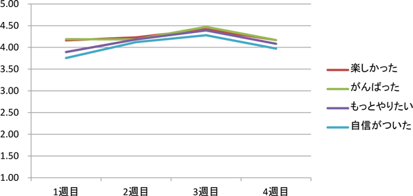 週ごとのアンケートでは、これまでの自主学習を振り返って、「たのしかった」「がんばった」「もっとやりたい」「自しんがついた」の4項目を5件法で尋ねた。1週目→3週目にかけて、4項目すべての値が上昇している。この学習スタイルが多くの子どもに受け入れられていること、また、がんばって取り組み、その積み重ねによって自信がついてきている様子がうかがえる。ただし、有意ではないが4週目では値が頭打ちとなっている。上昇トレンドの中で上限に近付き値が伸びにくくなったのに加え、このスタイルの学習に対する評価が子どものなかで定まってきた結果と言えそうだ。