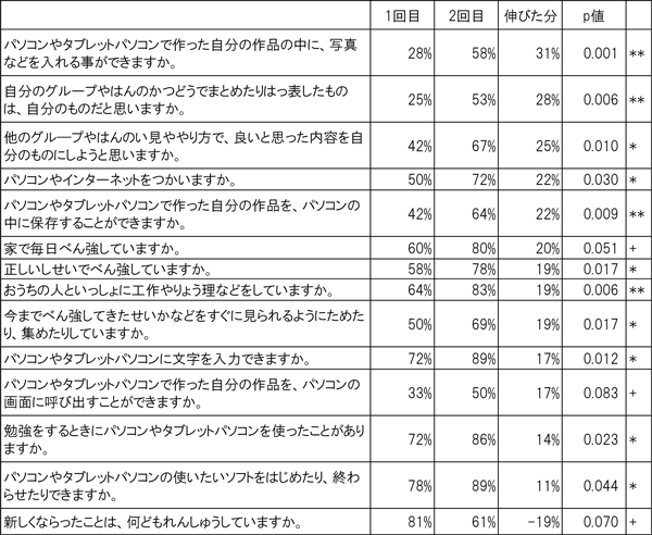 母数が少ないことや2件法ということもあり、慎重に考えなければならないが、前後のスコアで有意に変化していたのは表2の14項目だ。今回、タブレットを利用した学習を初めて行うという子どもが多いと思われるので、タブレットやパソコンに関する項目のスコアが上昇するのは予想どおりである。ただ、それ以外にも、「正しいしせいでべん強していますか」「家で毎日べん強していますか」など、学習に関する項目、「自分のグループやはんのかつどうでまとめたりはっ表したものは、自分のものだと思いますか」という共有に関する項目もスコアが上がっていることは、注目すべき点だろう。