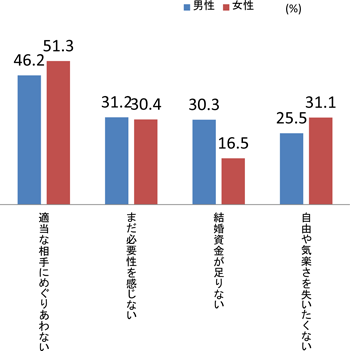 もう一つ、結婚する・しないを左右するものに、その人自身の「結婚意欲」があげられます。団塊世代が結婚した頃、見合い婚は半分程度ありました。その後、恋愛結婚が見合い婚よりも増え、現在は見合い婚が全体の5%まで減りました。つまり、本人の意欲がなければ、結婚できない世の中になっているのです。年収300万円未満であると、結婚意欲もなかなか持てないというデータもあります。また、独身にとどまる理由の調査では、一番多いのが「適当な相手にめぐりあわない」ということです(図3)。