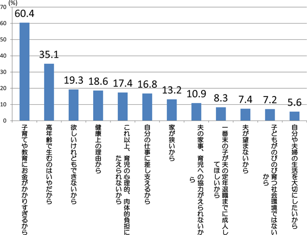 ①女性の社会進出とそれに伴う仕事と子育ての両立支援の困難、②結婚市場のミスマッチ、③若年層における雇用の悪化、④パラサイト・シングル、⑤若い世代の結婚・出産に対する価値観の変化、⑥子育てや教育にかかる費用の重さ、⑦子育てにかかる心身の負担の重さ、以上7つです。