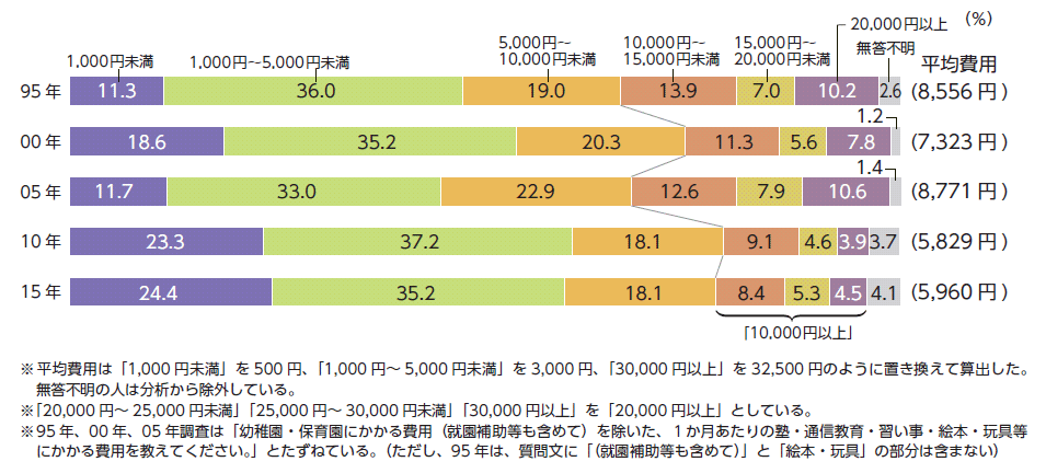 教育費については、全体的に減少してきていることがわかりました(図4)。ここでいう教育費は「塾、通信教育、習い事、絵本、玩具などにかかるひと月あたりの費用。幼稚園・保育園にかかる費用は除く」を指しています。