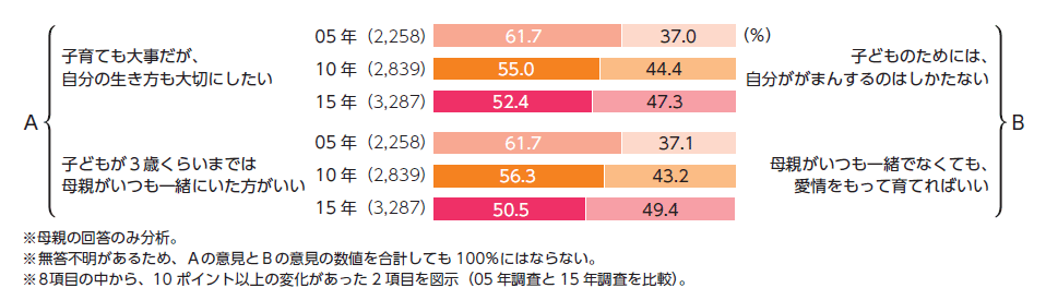 今回の調査では母親の子育てに関する価値観が多様化しているという結果も得られました(図5)。たとえば、「A 子育ても大事だが、自分の生き方も大切にしたい」と「B 子どものためには、自分ががまんするのはしかたない」という2つの子育て観についてどちらかを選択してもらったところ、2015年調査では、Aが52.4%、Bが47.3%と、ほぼ二分されていることがわかります。また、「A 子どもが3歳くらいまでは母親がいつも一緒にいた方がいい」「B 母親がいつも一緒でなくても、愛情をもって育てればいい」はAが50.5%、Bが49.4%と、こちらも二分されています。どちらの子育て観が正しいということではなく、母親がもつ意識がちょうど半分ずつくらいに分かれているという結果です。