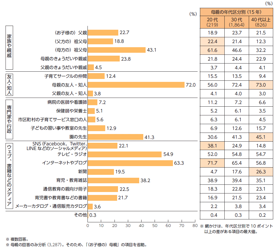 また、もう一点注目すべき結果は、しつけや教育の情報源です。母親の年代区分別に見ると、非常に大きな差があります(図6)。