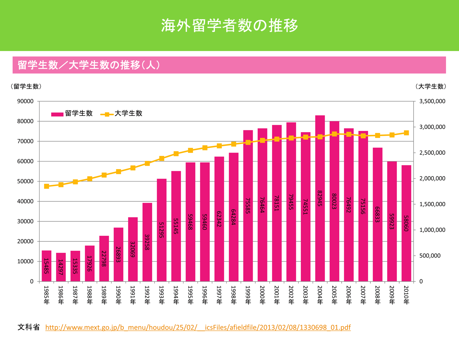 ここ10年の日本から海外への留学生データを調べてみると、アメリカとイギリスへの留学生を除くと、その他の国への留学生はごく少数の国を除いて実は増えています。たとえばドイツ、フランス、中国、韓国、カナダ、オーストラリア、ニュージーランドなどへの日本からの留学生は増えているのです。そういう事実があるにもかかわらず、全体の数だけを見て、海外留学が減ったと言います。あるいは、他人が海外留学者数激減と言っているのをそのまま鵜呑みにして、若い世代は元気がないと決めつけてしまうことも多いのではないでしょうか。留学者数が全体として減っていることは事実なのですが、全体数が減っているほぼ唯一の要因は、米英への留学者が減っていることで、したがってなぜ米英だけが減っているのかを問題にしなければならないのです。