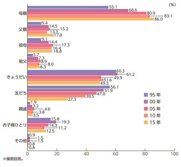 第5回幼児の生活アンケート)、保育園児の増加などを背景として、平日降園後に遊ぶ相手では、母親が増加し、友だちやきょうだいが減少しています(図1)。平日の遊びの場が家庭と園に集中しており、異年齢の中で遊ぶ機会が減少しているのではないかと思われます。家庭・園以外でのさまざまな人とのふれあいを通して得られる豊かな体験をいかに補うかも、今後の課題となるでしょう。