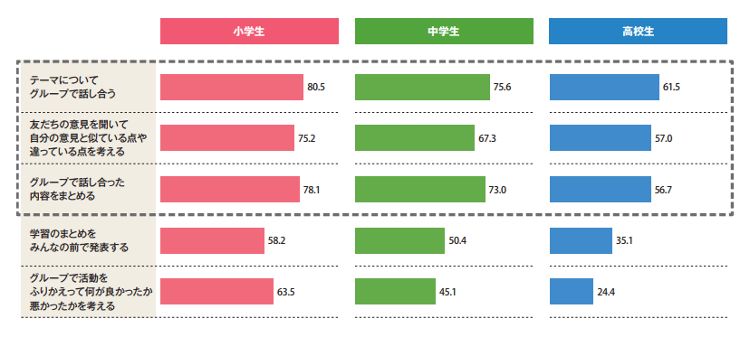 TIMSS2015・PISA2015や全国学力・学習状況調査の結果)。一方で、そうした量的な拡大が、必ずしも深い学びにつながっていない面が見られます。多くの学校がアクティブ・ラーニング(主体的・対話的で深い学び)を取り入れつつありますが、それがまだ形式的なものにとどまり、主体的、対話的な学びを通して、アクティブ・ラーニングの狙いである思考力の育成まで至っていないことが少なくないようです(図2)。