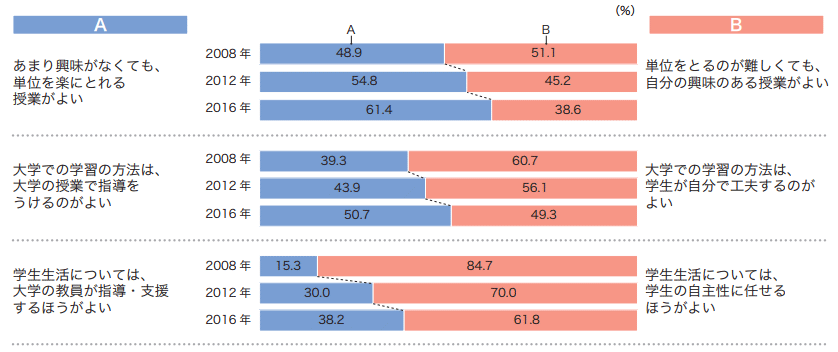 高等教育段階でも、アクティブ・ラーニングを取り入れた授業が増え、そうした学びに積極的に参加していると回答する学生の割合が高まっています。また、授業に毎回欠かさず出席し、課題にしっかり取り組むという学生も増えています。ただし、学生が主体的にそうしているかどうかは、慎重に見なければいけないと感じます。近年は、就職試験で大学の成績を重視する企業の増加が増えています。そのことで、学生が真面目さを演出せざるをえない面があります。また、大学生活や学修について、自分で考えるよりも大学や教員に指導してほしいという依存的な意識も強まっています。