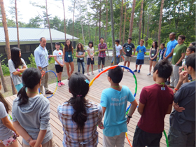 ISAKでは、座学の授業に加えて、屋外でのアクティビティが多いのも特徴だ。今日はフラフープを使ったアクティビティ※)だ。ざっと内容を説明すると、数名1組でひとつのフラフープを全員の両手人差し指だけに乗せ、立った状態から徐々に腰をかがめて座り、フラフープを地面に下ろすというものだ。