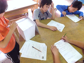 午前中とうってかわり、子どもたちは幾つかのグループに分かれて眉間にシワを寄せながら、プリントの問題を解いている。このグループ分けは習熟度別になっているようだ。早く解けた子どもは、解けていない子どもに教えている。