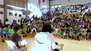 全校ミーティングが開かれるホールは、コロシアムを半分に切ったような構造になっている。階段状の席には、ぎっしりと子どもと大人が身を寄せ合いながら座っている。座席から下を眺めると、議長と書記らしい生徒2名だけがこちら側を向いて座っている。