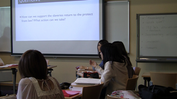 本日の「奴隷」に関するテーマ自体は先生が選んでいるようだが、問題提起を学生に課していることは特筆すべきことだ。「問題そのものは何か」という本質を発見する力を養成する狙いがあるのと同時に、授業そのもののクオリティを学生に委ねているからだ。EAPが「英語」という語学を学ぶためではなく、手段として学ぶための授業だったことは明らかだった。