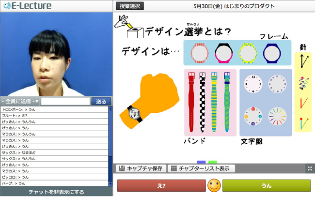 この2つのボタンにはちょっとした工夫があり、生徒が講義を聞きながら納得した際に「うん」ボタンを連打すると、画面上でその反応が「うん うん」、「なるほど」、「感動的」などに順次変化していく。逆に「え?」ボタンを押し続けると「??」、「???」、「!!」と変化する。この気軽に連打できる2つのボタンを使って生徒たちは反応を示すことができる。