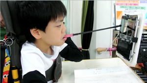 そう言って出してくれたのが、軽くて丈夫で、長時間使っても歯に悪い影響を与えない材質を選ぶなど、自ら工夫を重ねて手作りしたマウススティックだ。タブレットのタッチスクリーンに触れて反応させるため、先端には導電スポンジが取り付けてある。実際にその生徒が勉強している様子を、記録動画で見せてもらった。机の上に立てたiPad、その正面には車椅子にシートベルトのようなもので体を固定された生徒が座っている。両手が折れ曲がったままで自由が利かないその生徒は、口にスティックをくわえている。先生が教科書の一箇所を指し、「この言葉を調べてみましょう」と言うと、器用にスティックを動かしてiPadのホーム画面から辞書のアプリを起動して、文字の入力を始めた。