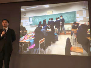 「これは学級崩壊ではありません」と笑いながら紹介する芝池氏。これまでは日々の生活の中に数学的思考を取り入れた生徒を育成できればいいと思っていたが、最近はそこに「人と寄り添う」ことの大事さも感じ始めているという。2つしか席の離れていない人にメールで連絡を取るような教育ではなく、わからない問題があった時に、ちょっとお隣さんに醤油を借りに行くような感覚で友達に相談できる環境をつくりたかったとのこと。iPadを使うか否か、どう使うかは生徒たちに任せているが、「生徒は勝手に使っている」という。積極的にICTを活用しているようには見えないが、「iPadを導入することで、あらためて自分はどのような数学を教えたいのかを考える、いいきっかけになった」と芝池氏は語った。