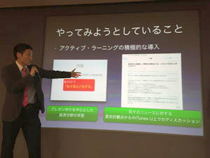 地歴公民科の教員である神野学氏もiTunes Uを活用している。高校2年生の「世界史B」と「現代社会」(近畿大学に内部進学する生徒中心のクラス。同校の内部進学率は約6割)、高校2年生の「倫理・政治経済」(国公立大学を受験する生徒中心のクラス)の授業の様子をiTunes Uで配布しているという。