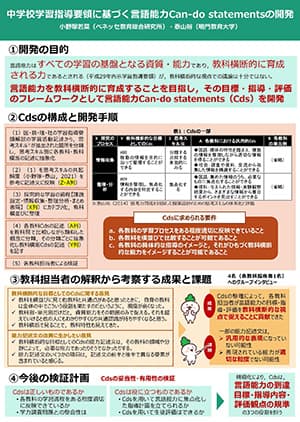 4教科の教科担当者各1名に対し本Cdsに関するインタビュー調査を行った結果、Cdsの整理によって、各教科担当者が言語能力の目標・指導・評価を教科横断的な視点で捉えることに貢献できたことが示唆されました。これはCdsの開発の目的に適うものです。