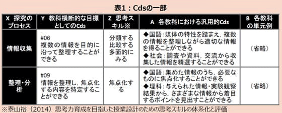 (2)(1)を思考スキルの共起頻度(小野塚 若菜、泰山 裕、2021「中学校学習指導要領およびその解説における教科ごとの思考スキルの共起頻度」)で見いだされた特徴を参考に、Cds項目に反映させます(表1のZ・A列)。ここでのA列は教科担当者がイメージしやすくするために各教科の文脈で解釈したものです。その指標の例として、B列に単元例を記載しました。