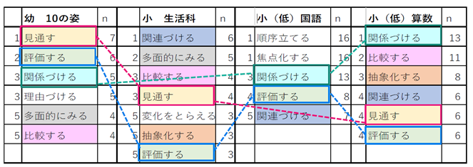 10 の姿および小学 1,2 年の国・算・生活の学習指導要領解説の記述内容を対象に,その活動で子どもの発揮が想定される思考スキルを19の枠組みから判断し、対応付けました。