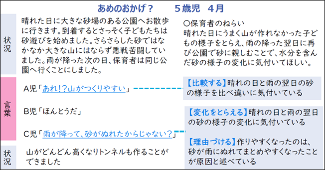 5歳児が思考を働かせていると想定できる具体的な遊び(35事例)を対象に、遊びのなかの言葉を手がかりに発揮している思考スキルを想定し、対応づけを行いました。