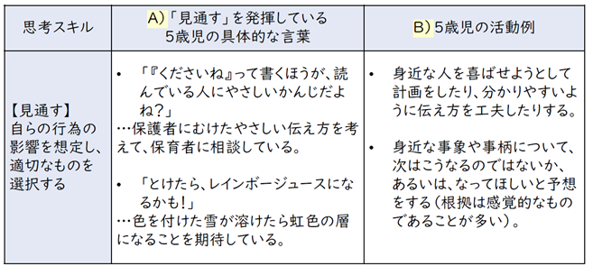 表3:思考スキルの発揮を想定できる5歳児の具体的な言葉と活動例(当日発表資料より抜粋)