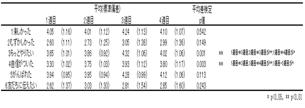 自分で自分に合ったテーマを設定し、それをがんばってやり遂げたことで満足感を感じ、「1 楽しかった」といった達成感につながる項目の評価を押し上げていると推測されます。さらに、「3 もっとやりたい」「4 自信がついた」のスコアは週を追うごとに有意に向上しています。ただ、学習内容の公開が前提なのにも関わらず「6 友だちに伝えたい」のスコアは2.62~3.03の間で、1→2週目で若干向上するものの、それ以降はほとんど変化しませんでした。