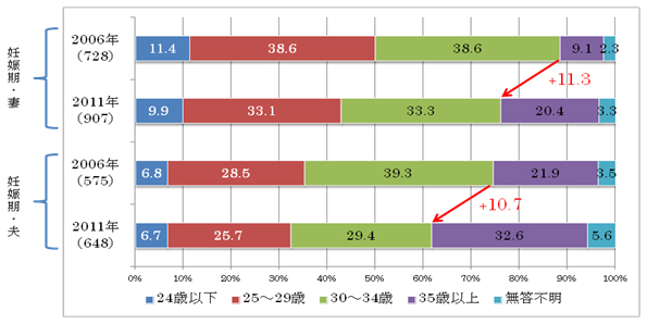 当研究所で実施した「妊娠出産子育て基本調査」でも、2006年と2011年の調査結果を比較すると、35歳以上になって第1子を持つ人が5年間で男女ともに10ポイント以上増加していました(図1)。