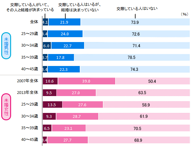 今回の調査結果で驚いたのは、「交際相手がいない」と回答した人が未婚男性で73.9%、未婚女性で63.5%に上ったことです(図2)。未婚女性の場合、2007年調査と比較して13.1ポイント増えていました。未婚男性の5割、未婚女性の6割以上は「ぜひ」「できれば結婚したい」と回答していますが、結婚に向けての準備が整っていないことが分かりました。