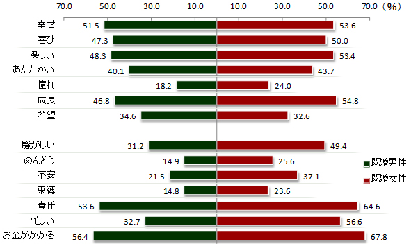 また、子どもがいる暮らしのイメージを聞いたところ、男女ともに1位は「お金がかかる」が最も多く、次いで「責任」第3位は男性が「楽しい」女性が「忙しい」でした(図5)。