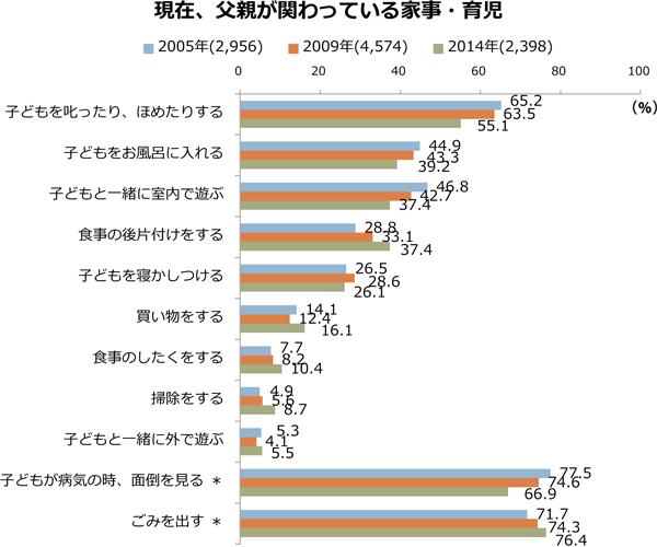 「家事や育児に今以上に関わりたい」という父親が6割近くになり、9年間で増加している(図1)。一方で、関わりの実態を見ると、「ごみを出す」「食事の後片付けをする」以外のことは大きく増加していない(図2)。実際に関わっている時間で見ると、平成23年の社会生活基本調査(*2)では、父親の育児時間は25分、母親は196分となっている(平日の平均、末子が6歳未満の場合)。ここからも平日の育児にあまり関われていない父親の様子がうかがえる。