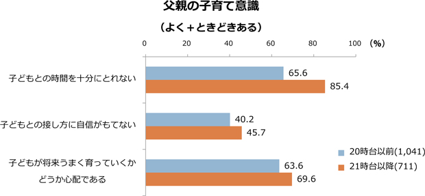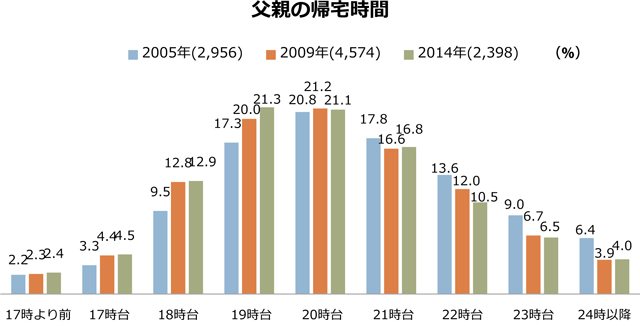 また「子どもとの接し方に自信が持てない」と回答する父親が増えている。この背景には、先に述べた「イクメン」のイメージが社会に広がり、周囲から期待される一方で参考にすべきモデルがいないことや、仕事からの帰宅時間が依然として早まっていないことなどがあげられるだろう(図3)。乳幼児と接するには、就寝前の時間に帰宅していることが必要であるが、乳幼児の就寝時刻のピークは21時台であり(*3)、それまでに帰宅できない父親が全体の約4割を占めている。今以上に関わりたいという思いを持ちながら、関われていない父親の姿がうかがえる。この傾向は5年間変わっていない。