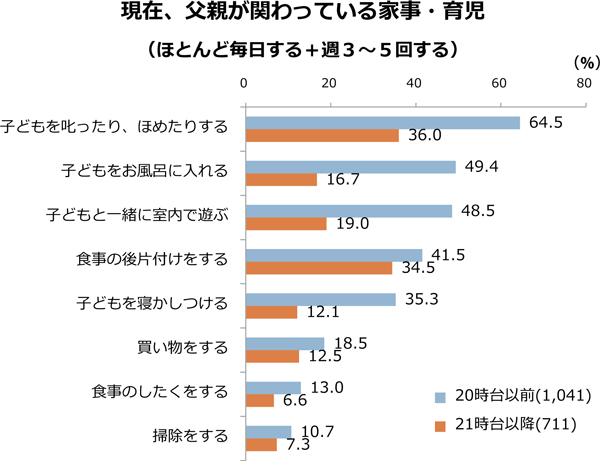 帰宅時間が早い父親は、家事・育児を多く行い、生活満足度が高い