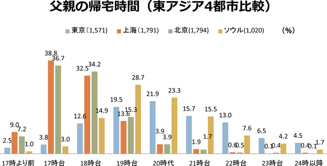 国際的に見ても、日本の父親の帰宅時間は遅い。図4は、北京・上海・ソウル・東京の乳幼児の父親の帰宅時間である(*4)。4都市で平日の帰宅時間がもっとも遅いのは東京の父親である。北京・上海の父親は約7割が17~18時台に帰宅する。一方東京の父親は、平日は子どもと関わりたいと思っても厳しい状況にあるが、仕事に追われて帰宅が遅くなる平日の分を取り戻そうと、休日に埋め合わせをするかのように、休日は「10時間~ほぼ1日」子どもと一緒にすごしている父親が約半数を超えている(図表省略)。