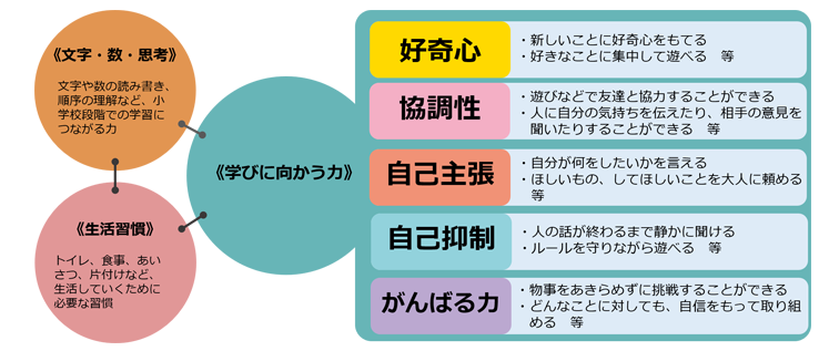 ベネッセ教育総合研究所では、遊びを中心とした幼児期の生活から、小学校の学習生活にスムーズに移行し、適応するために必要な力、幼児期に育みたい生涯にわたって必要な力について検討し、「生活習慣」、「学びに向かう力」、「文字・数・思考」の3つの軸を設定した。「学びに向かう力」は、「好奇心」、「協調性」、「自己主張」、「自己抑制」、「がんばる力」の5つの要素で構成した。これらの要素は、小学校以降の「学び」に「向かう」ために、幼児期に特に育みたい力である(図1)。