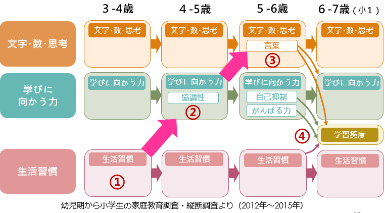 2012年より、国内の母親を対象に、年少児(3~4歳)から毎年、同じ母親に対して縦断調査を行い、子どもの発達状況や環境の変化等を把握してきた(調査は、子どもが小学校4年生になる現在も継続している)。縦断調査の結果から、年中児期(4~5歳)での「学びに向かう力(協調性)」の発達は、年長児期(5~6歳)での「文字・数・思考(言葉)」の発達に波及することがわかった(図2)。「学びに向かう力」のネーミングどおり、社会情動的なスキルは、「文字・数・思考」といった認知的な力をつける下支えをしていると言えよう。
