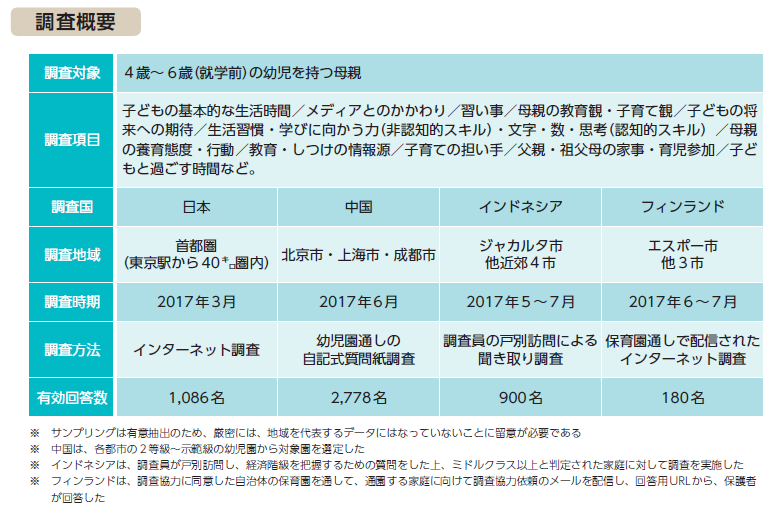 この「学びに向かう力」尺度を、文化的な環境や風習の違いに配慮しながら、各国語に翻訳した。そして、各国の実情に合わせてもっとも適切な手法で調査を行い、社会文化的に異なる環境に育つ幼児の発達状況の把握を行った。調査にあたっては、各国の幼児教育や発達心理の専門家に監修を頂いた(「幼児期の家庭教育国際調査」速報版を参照)。調査の時期は、各国の小学校入学月の1~3か月前に揃えた。調査の地域は、日本は首都圏、中国は北京市・上海市・成都市、インドネシアはジャカルタ市と近郊4市、フィンランドはエスポー市と他3市で、いずれも都市部である。よって、本調査は、国名で示しているが、都市部の傾向であることはご承知おきいただきたい。