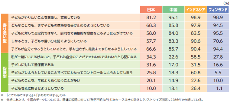 筆者が調査前に各国の母親たちに会って、子どもに注ぐ愛情やまなざしに、同じ母親として感じた共感——それを、本調査では「養育態度」尺度として分析を試みた。「養育態度」は、本調査では、「寄り添い型(supportive)」と「保護型(protective)」の2軸で設定し、それぞれ5項目で調査した(図4)。
