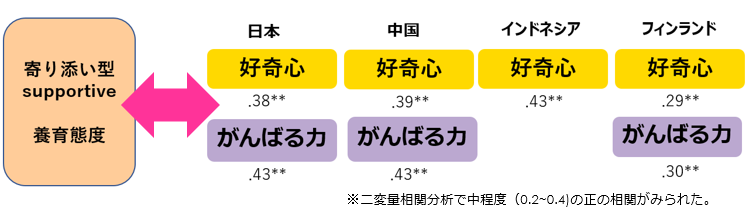 結果、養育態度も、各国で、母親が子どもの気持ちに寄り添い、尊重するようなかかわりである「寄り添い型養育態度」をしているという共通の傾向が見られた。そして、母親の、寄り添い型のかかわりは、子どもの「好奇心」や、「がんばる力」の発達に関連していることがわかった(図5)。この結果は、「好奇心」、「がんばる力」といった力を育む上では、過保護だったり、子どもの言動をコントロールしたりといった「保護型養育態度」よりも、子どもがやりたいことを尊重し、子どもがやっていることに手を出さずに見守るような、「寄り添い型」のかかわりかたが重要であるということを示しているといえる。